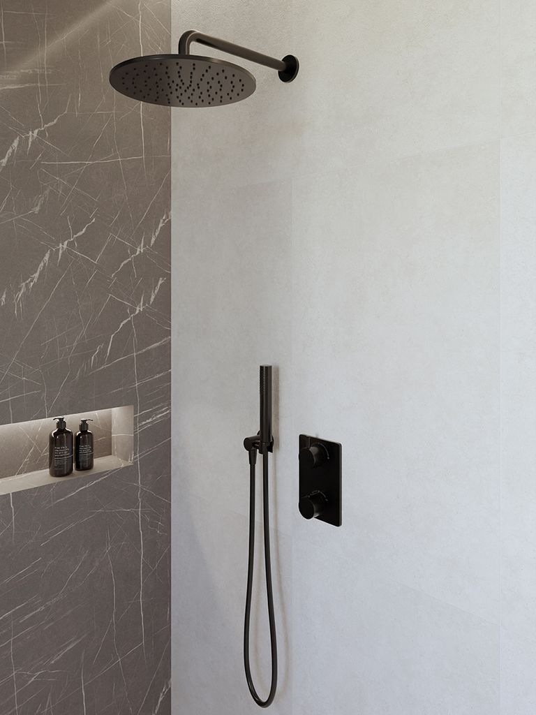 Caral inbouwthermostaat compleet met hoofddouche 30 cm, staafhanddouche, doucheslang en -arm mat zwart